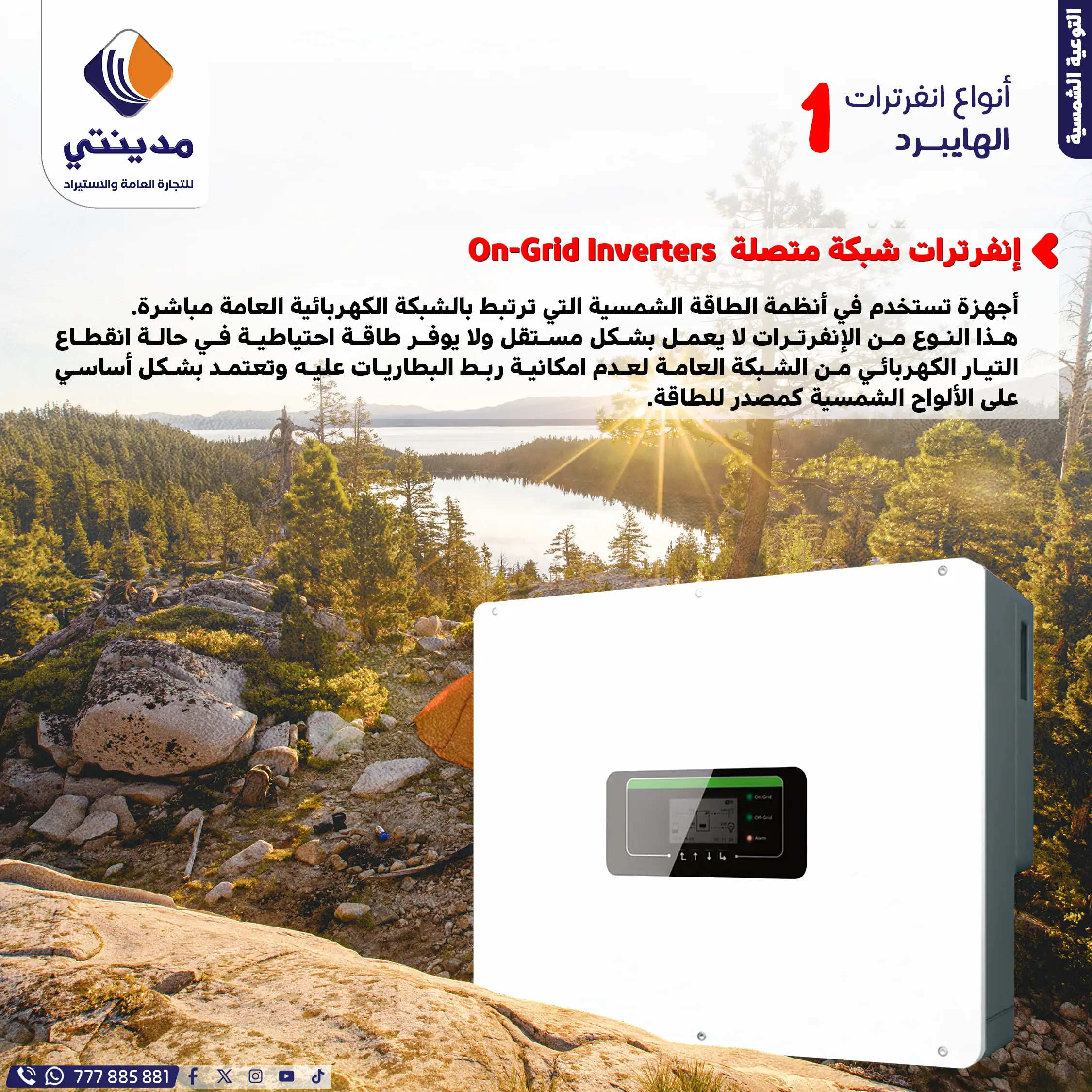 • الإنفرتر المتصل بالشبكة يعمل على تحويل الطاقة الشمسية من التيار المستمر (DC) إلى تيار متناوب (AC) ويتم توصيله مباشرة بشبكة الكهرباء العامة.